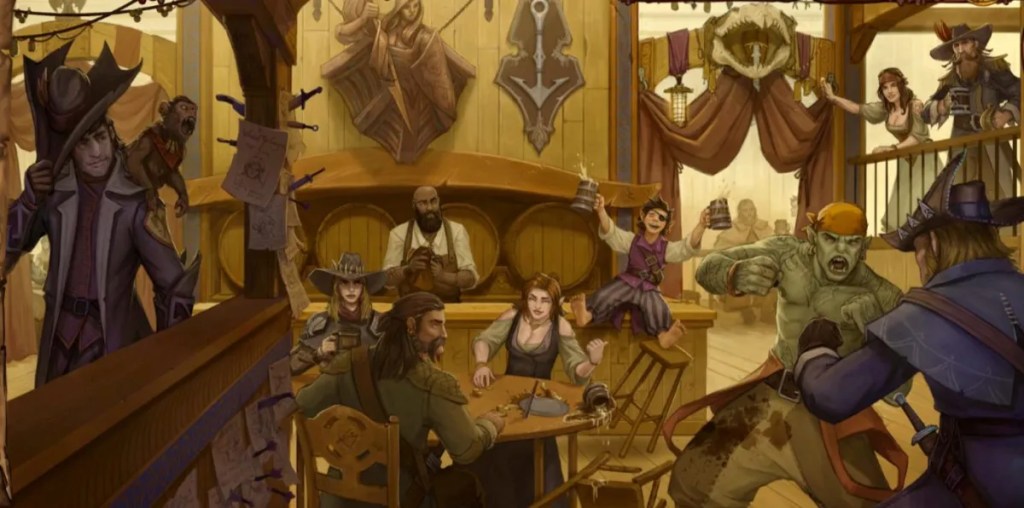 | 18-20 | Good music, good drinks, dancing, good stories…. You meet someone who gives you a solid lead on a job or adventure… (1d6: 1=a foreign envoy; 2=a foreign merchant; 3=a merchant; 4=a local official; 5=a royal official; 6=a minor noble passing thru). Name that NPC and give them a backstory. (See Non-Player Characters.) |