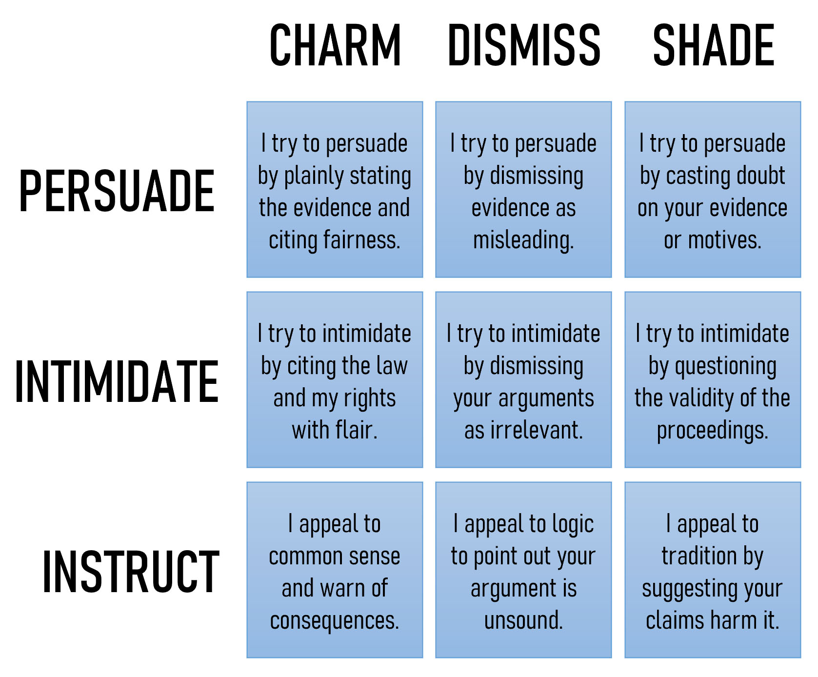 - If the winner makes three in a row vertically (using all shade, charm, or dismissal techniques), the argument is weak and relies on rhetoric, and the judgment or audience reaction may include some compromise or a split opinion.