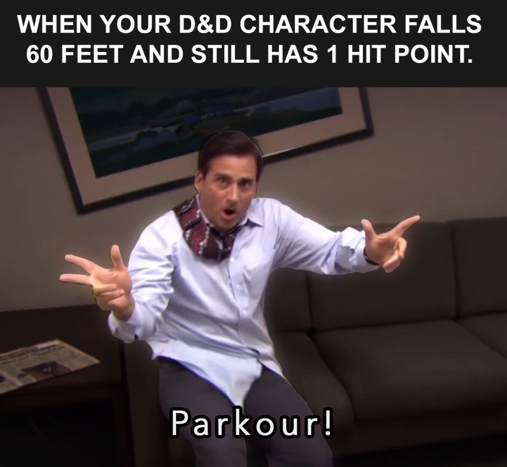 I continue to read up on Dungeons & Dragons and watch homebrew rule videos for D&D and other systems. I’ve been reading both the 4th Edition (which I never played) and 2nd Edition (which I played extensively) books, and I marvel at the fact that Wizards of the Coast has never solved the falling damage problem.
