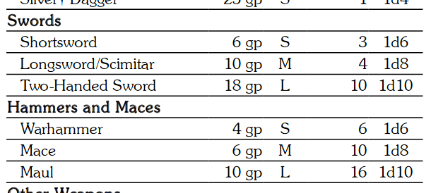 In my continued nostalgic foray in Dungeons & Dragons and other fantasy RPG gaming, I have visited the idea of weapons and their differences. This is something that D&D’s creators and designers have always struggled with. Why choose a mace over a longsword?
