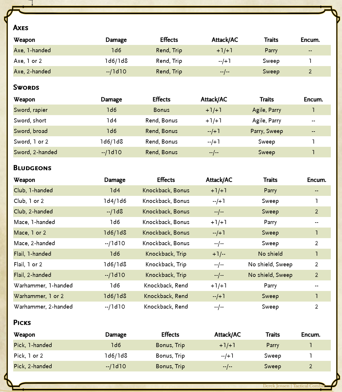 So I set out to create some simple tactical options for combat and a few carefully chosen extra features, mostly for fighters and rogues. They’re short enough that I decided to post them here as well in somewhat expanded format. They include versions of some rules I’ve posted here previously.