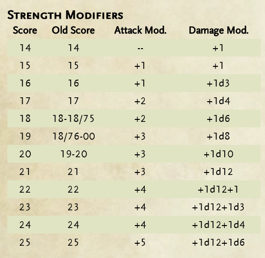 Strength gets attack and damage bonuses at lower scores, but adventurers do not get percentile strength. These modifiers only apply for dexterity instead of strength (never both) when using a weapon with the DEX trait.