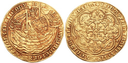 The gold noble was introduced in 1344 and was the right mass to be the traditional D&D gold piece (9 grams, or 50 to the pound of weight). It had a value of 1/3 of a pound sterling, or 80 pence. I prefer to call it a “gold crown”, because it features the monarch.