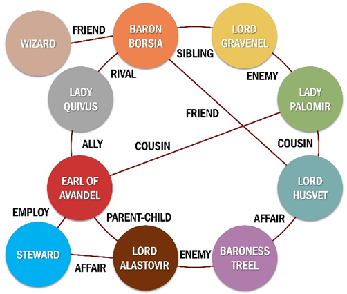 - Lady Evral is secretly in league with the foreign prince the king wants to wage a campaign against (-5 if it comes out). Lady Bracwell has learned this and would like to expose her to the king (5 points) but is herself in league with a faction of raiders that is currently delaying the king’s campaign (-3 if it comes out), and Lord Hather knows it; but he has something he wants from Lady Evral (5 points)….