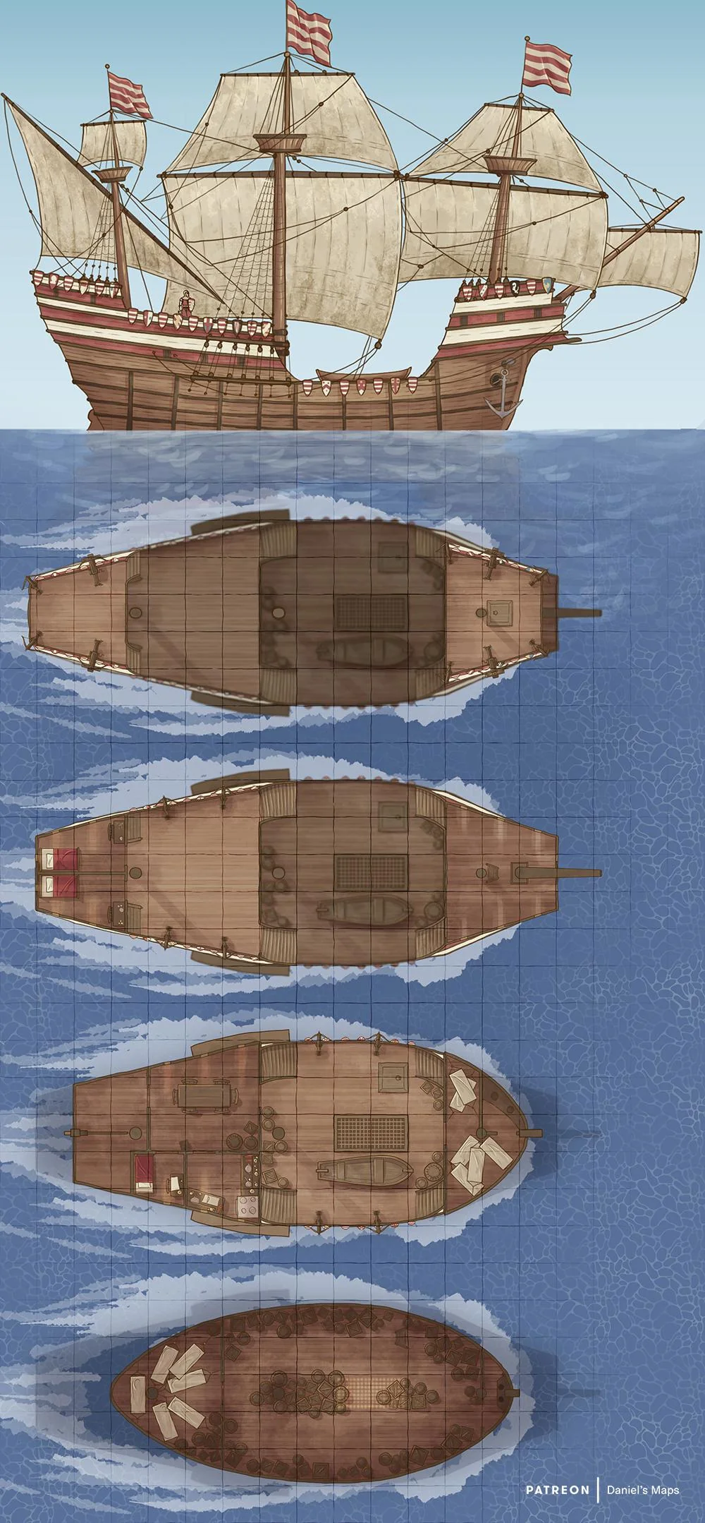 Take a sailing ship: you can be up among the sails, down on the quarterdeck, main deck, or foredeck, or belowdecks, or out in the sea–and in rapid succession. There are ladders, stairs, and rope everywhere; you can cut a rope to drop a sail or to be pulled up among them, swing across the deck, and tie things down or tie people up.