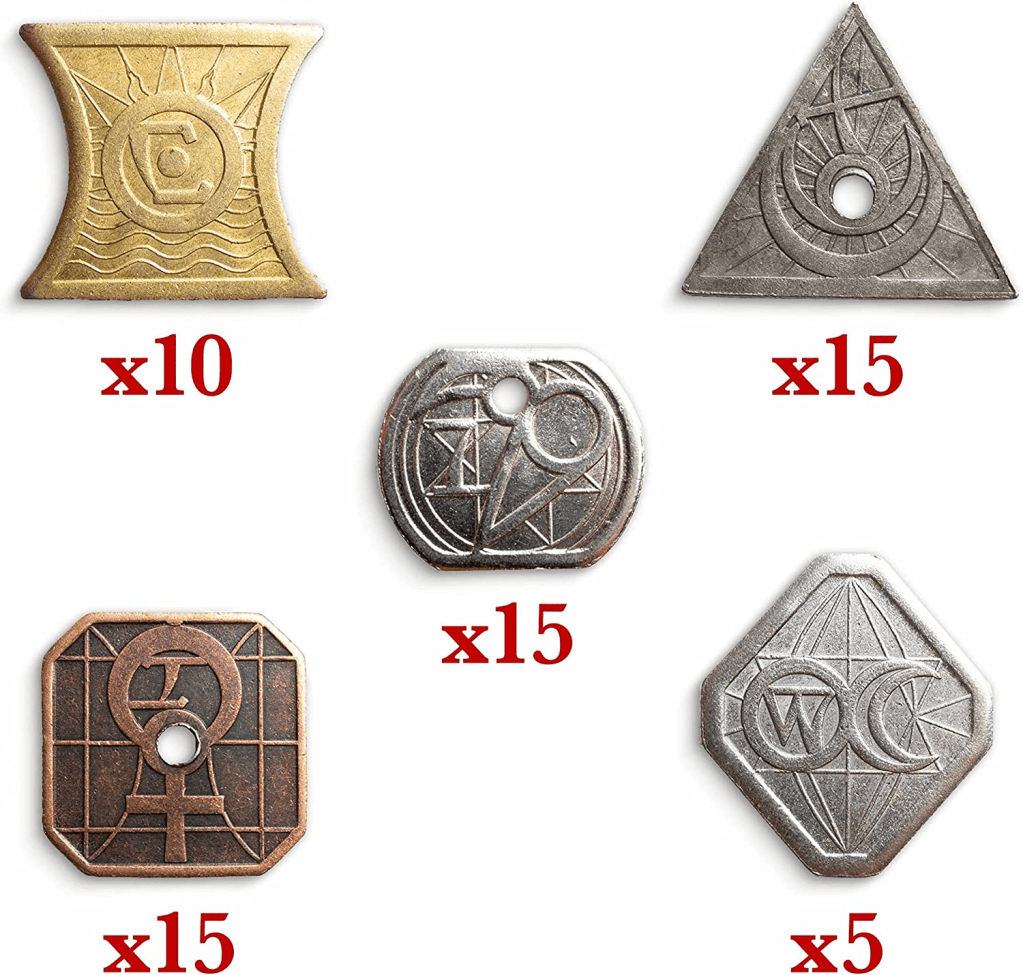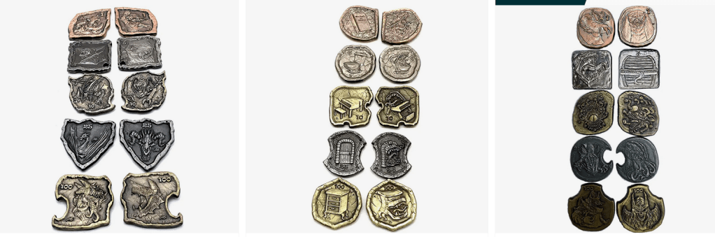 Meeple Source sells the Stonemaier sets, including the Scythe special edition 2 and 50, as well as their own set. Their fantasy set is solid, but pricey at $1 per coin. At half that price, I’d consider them an almost ideal set, altho I don’t love the monster theme.