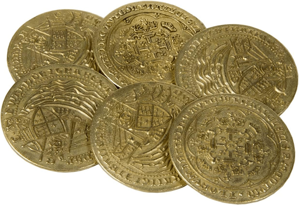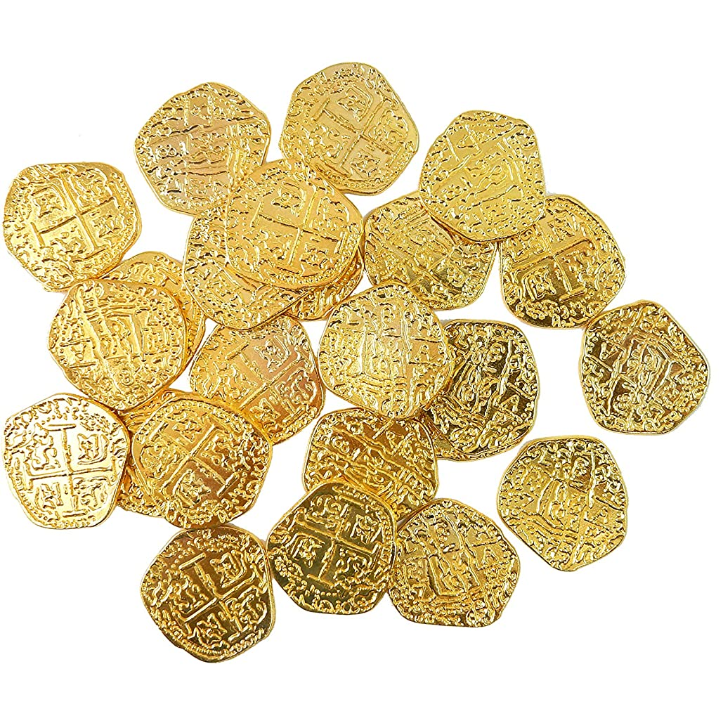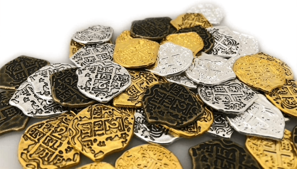 Beverly Oaks has their own pirate coin, explicitly described as being modeled on the 2 escudo but without a clear “2” on them. Moreover, these appear to be a variety of shapes, which is more realistic for crudely minted cob coins. They also offer a set in gold, silver, and copper (or maybe that’s supposed to be bronze), but they’re identical except for color.