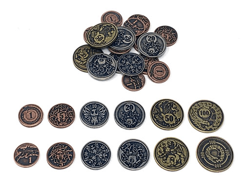 Stonemaier Games makes a beautiful set for Scythe in 1, 3, 5, 10, and 20 denominations. Some don’t care for the style, but I like it–altho I don’t care for the 5: it features Soviet iconography, which is out of place for most games. These are also budget-friendly, at just 31¢ per coin. The 20s are 30mm, which means they should be silver. That would allow for a small, medium, and large gold 50, 100, and 500.