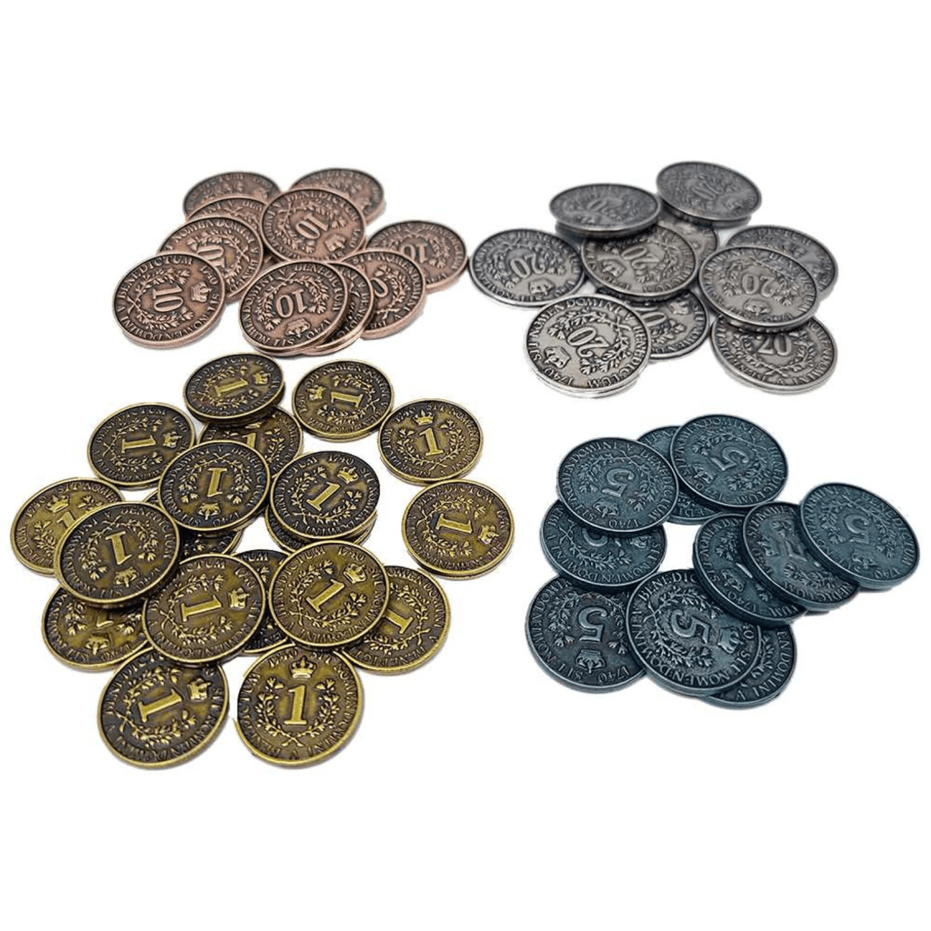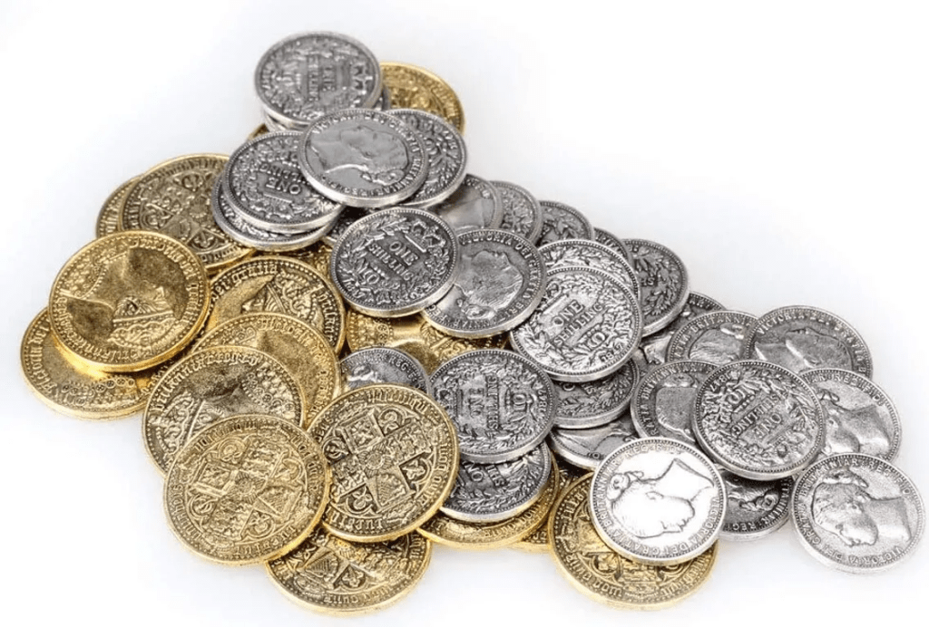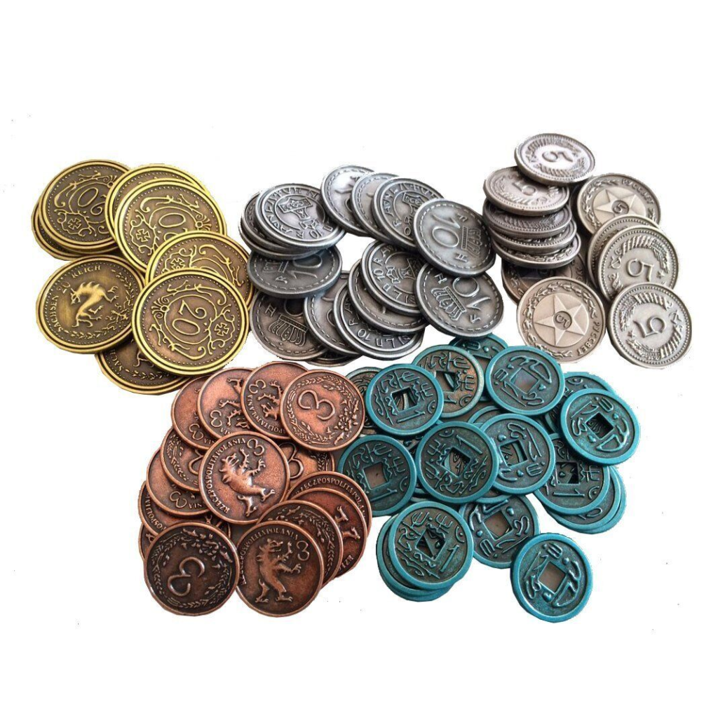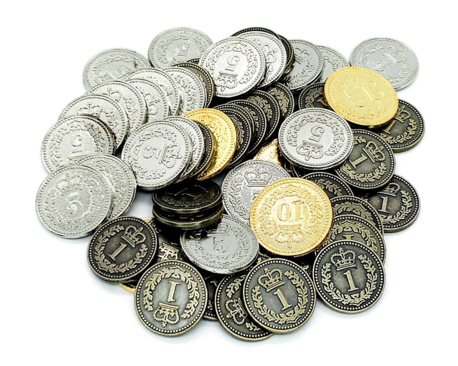 One great upgrade for board games is swapping out the standard money–usually cardboard coins–for metal coins. Shiny, weighty coins provide a satisfying experience. But no one seems to make a really solid, universal set. Here, I try to show the best choices and imagine the ideal coin set.