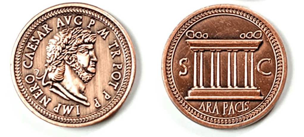 Top Shelf Gamer is a board game token seller on Etsy as well as on their own site. They offer a nice-looking set of coins for the game Rococo that are 1, 5, 10, and 20 on the smaller side (18 to 24mm), but the designs are the same front and back–and from coin to coin, except for the number. And I’m not sure why anyone would make the 1 gold-colored or the five blue. On the plus side, they’re just 40¢ apiece.
