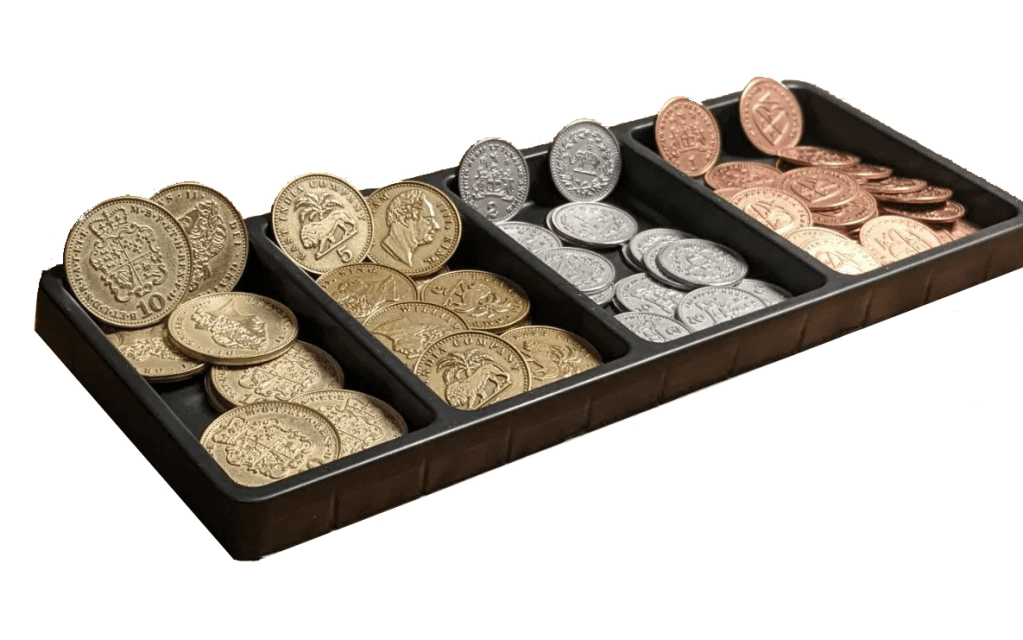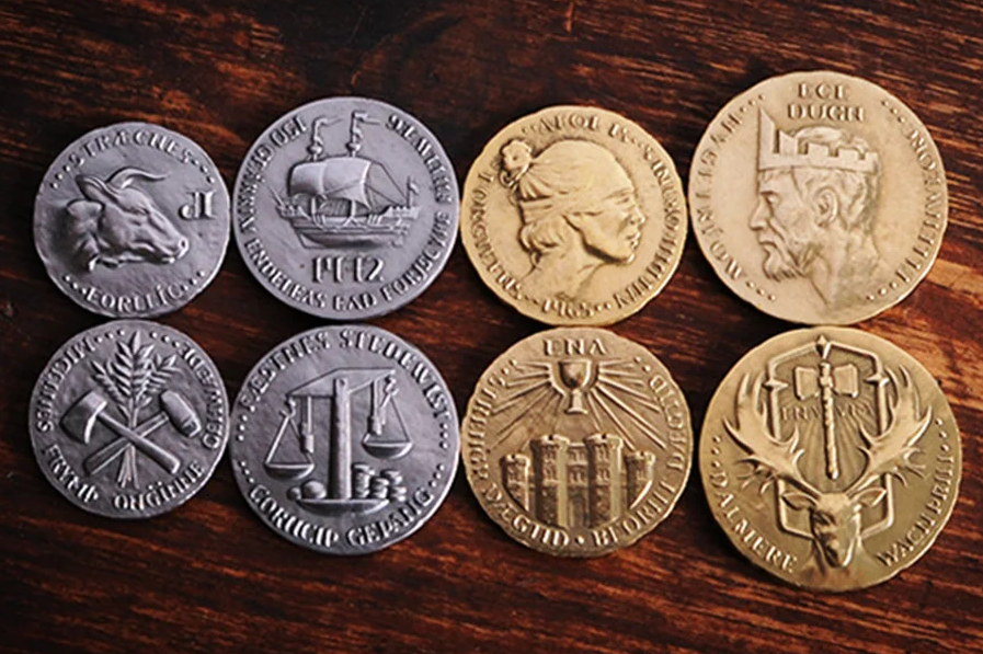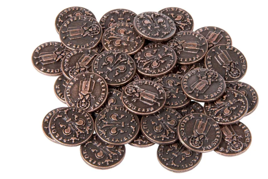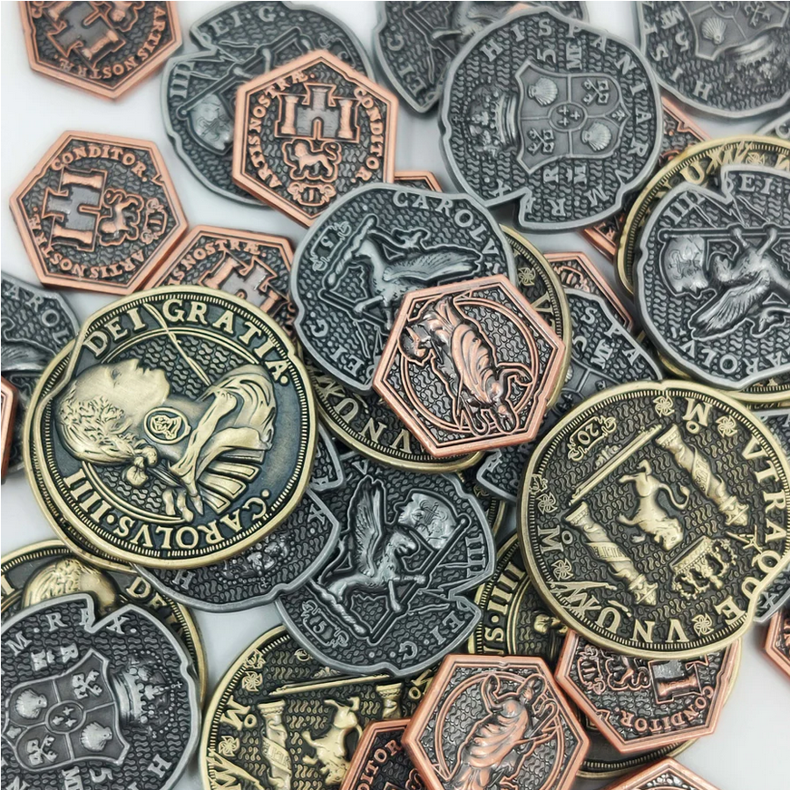 Miniatures Marget still has some of Aegir Games’ metal coins for Europa Universalis in 1, 5, and 10. They feature realistic designs reminiscent of the 1600s and are clearly denominated on the reverse. Colored gold, they could be the top tier of a bank, representing 1, 5, and 10 crowns (100, 500, and 1000 coppers).