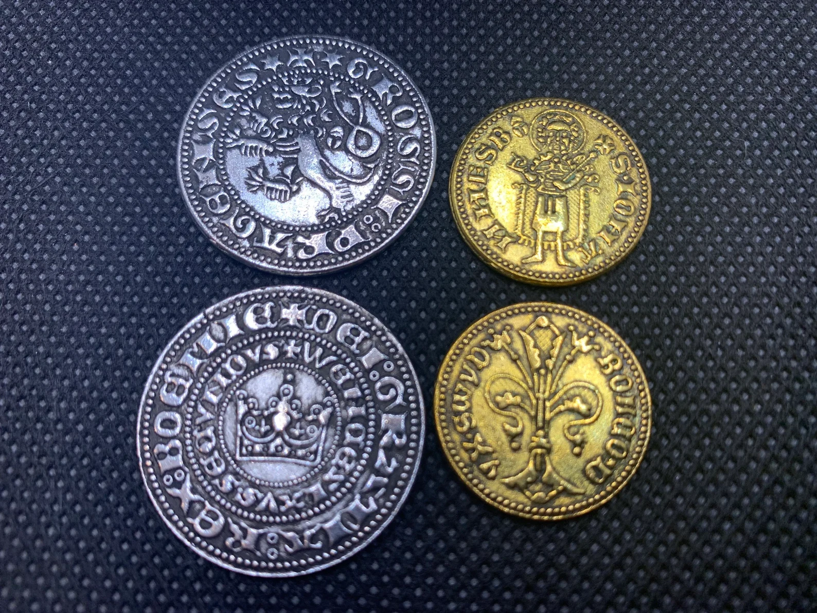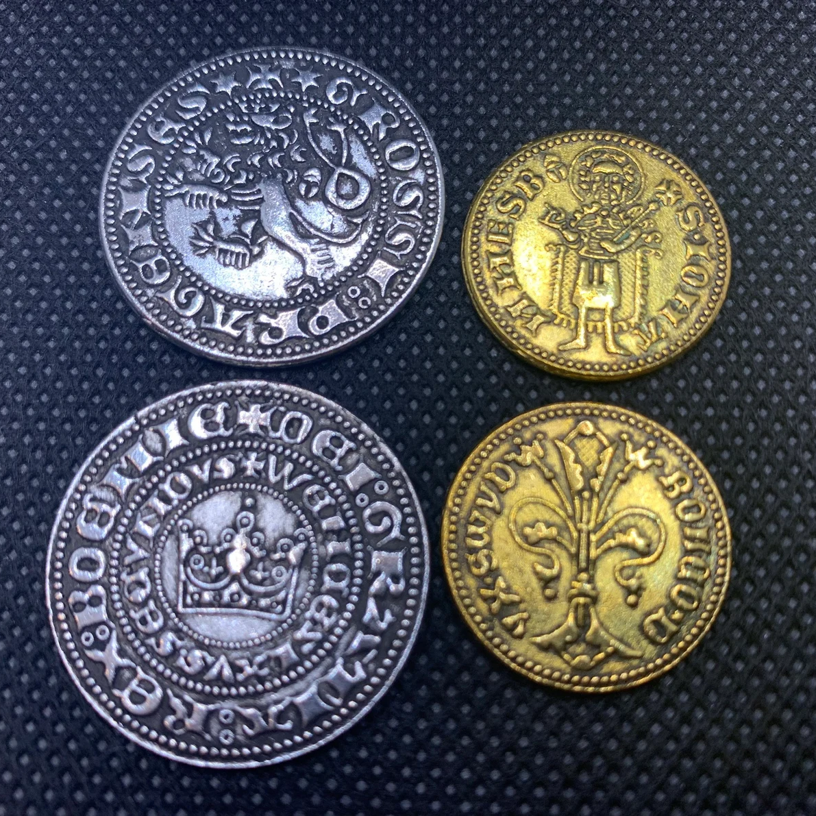 Golonko is an Etsy store that sells game tokens. Their coin offerings include a really beautiful set of one 28mm silver and one 21mm gold coin modeled on the Prague grosch and Hungarian florin.