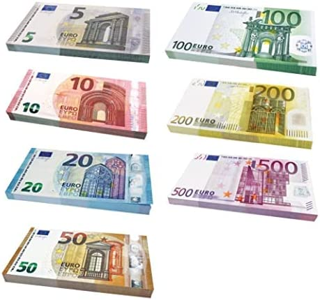 Scratch Cash on Amazon has a great set of 75% size Euro banknotes: 5, 10, 20, 50, 100, 200, and 500 denominations. But if you like ’em big, there are also 125% versions. There are also Spanish banknotes in 500, 1000, 2000, 5000, and 1000 pesetas at full size. And also old Deutsche marks.