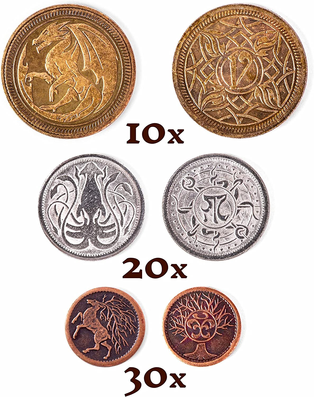 Moedus & Co make a great variety of lovely metal coins for gaming, but they are closely aligned with specific games and often either don’t have denominations or have the same design on both sides. However, I’m partial to their Lisboa set in 1, 5, and 10 denominations. They are 21mm, 24mm and 27mm.