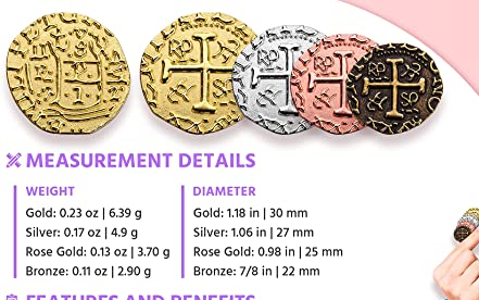 They also make gorgeous historic gold coins of two designs: Early English Nobles and Spanish Pieces of Eight. Both being 35mm, these are too similar to use together. They’re also expensive, at $1.67 each, so you might save these for your top-tier 500 or 1000 denomination gold piece, of which you only need a few.