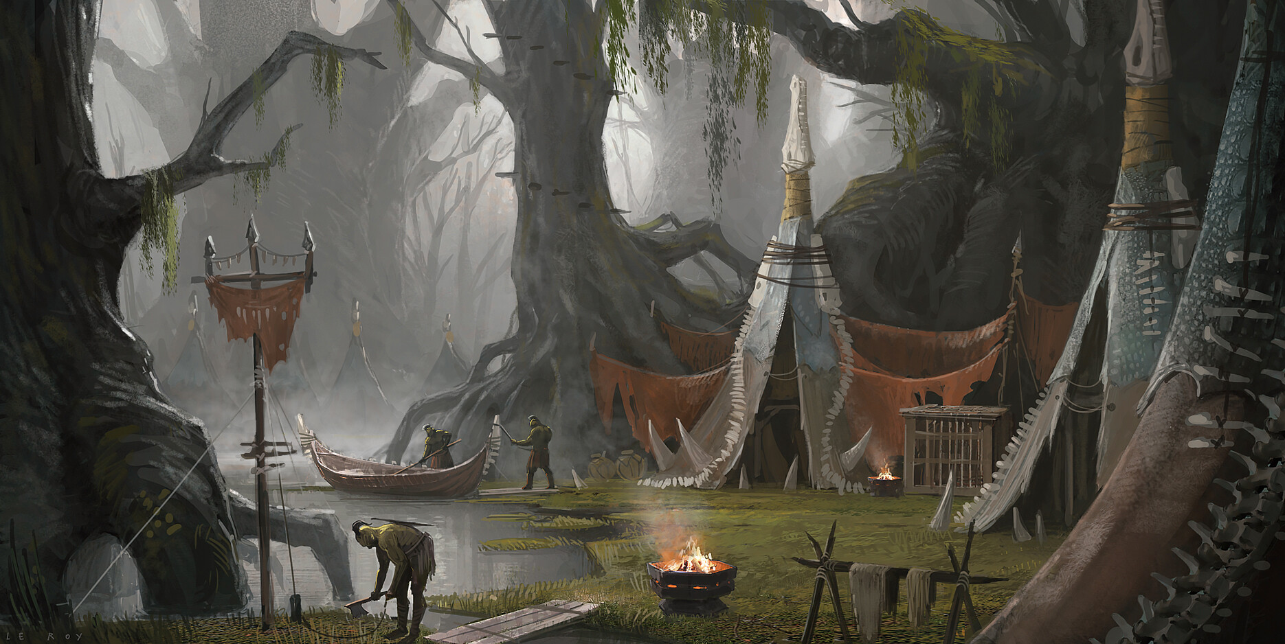 The most unnatural of the dungeon dwellers, dark elves live in large natural caverns, where they cultivate the same moss, mushrooms, algae, worms, and other things that kobolds do, as well as cave fish and bats and the flesh of beastly monsters they hunt.