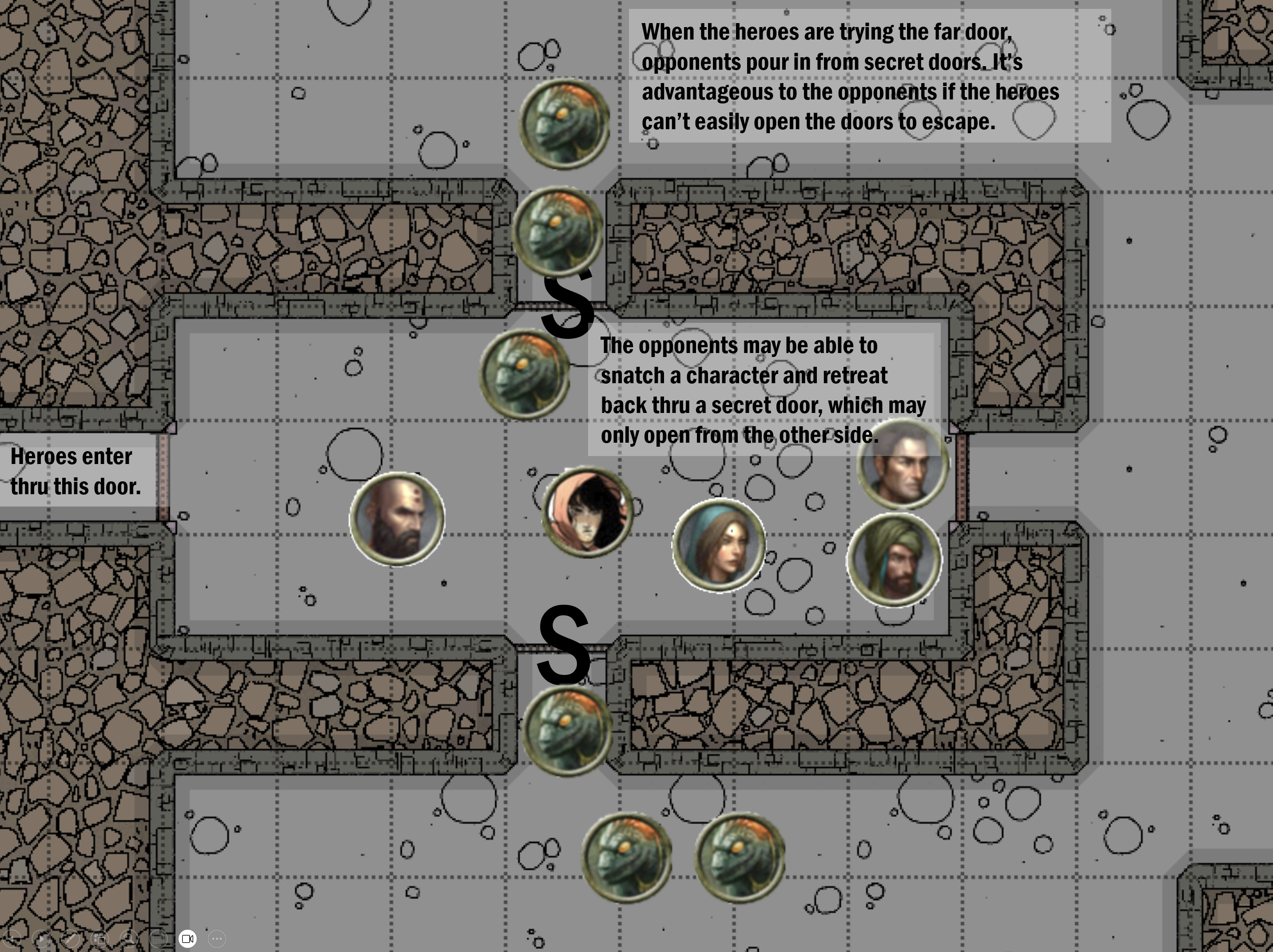 - The opponents insist on fighting from the cover of the doorway, where the heroes can’t all attack. Remember the monsters only want to keep the heroes out; they may even retreat and close a door or gate.