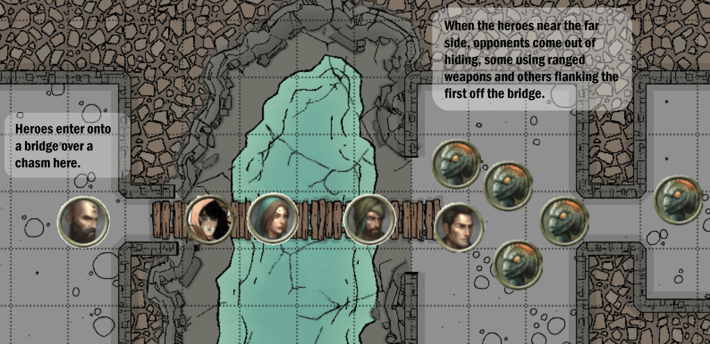In one version, small opponents, such as goblins or kobolds, lure the heroes into what appears to be their camp’s defensive stockade with an unguarded, narrow entrance. But in fact, the back palisade wall has holes in it big enough for the opponents to slip thru and too small for the heroes. Now the opponents can join allies in attacking the heroes with ranged weapons thru the holes in the palisade.