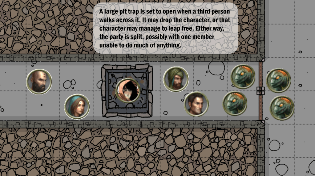Another form of trapping maneuver is an actual pit trap that drops one or more characters down a level, where guards are waiting. It could even deliver them into a cage.