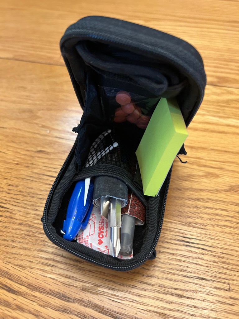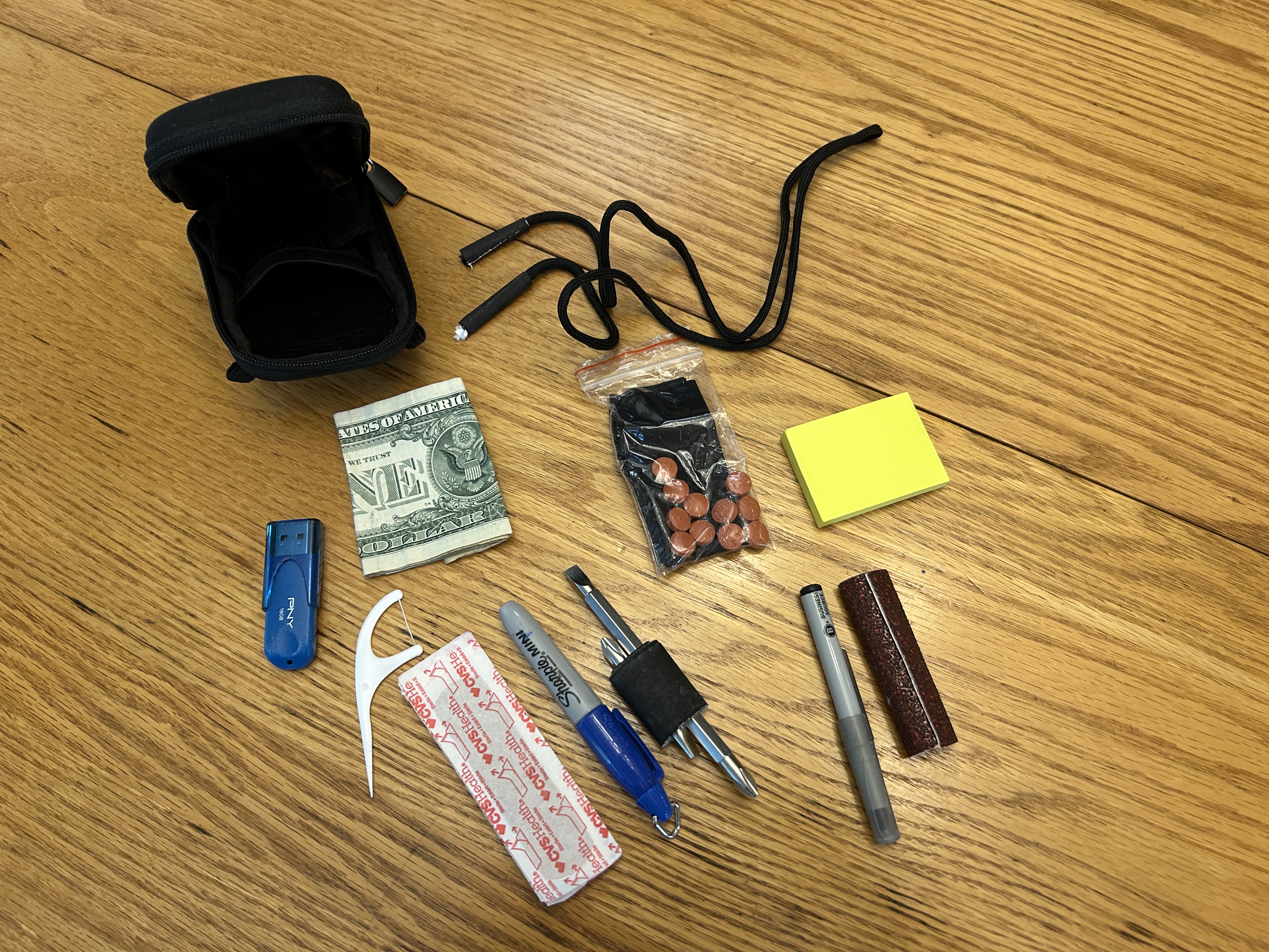 A couple of years ago, I put together a bag for my car so I would have things handy for unusual situations. I say “unusual situations” and not “emergencies” because, realistically, I will probably die in any real emergency, and it won’t be for lack of a signal whistle or can opener.