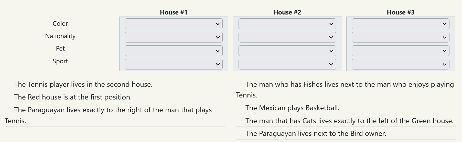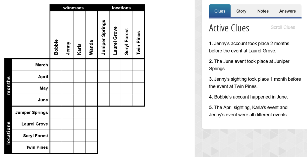 Another type of logic puzzle is called a “zebra puzzle” because its first version asked “Who owns the zebra?” This type is easier to work without a grid being given to you, because players will naturally create columns for clues about each house in order.