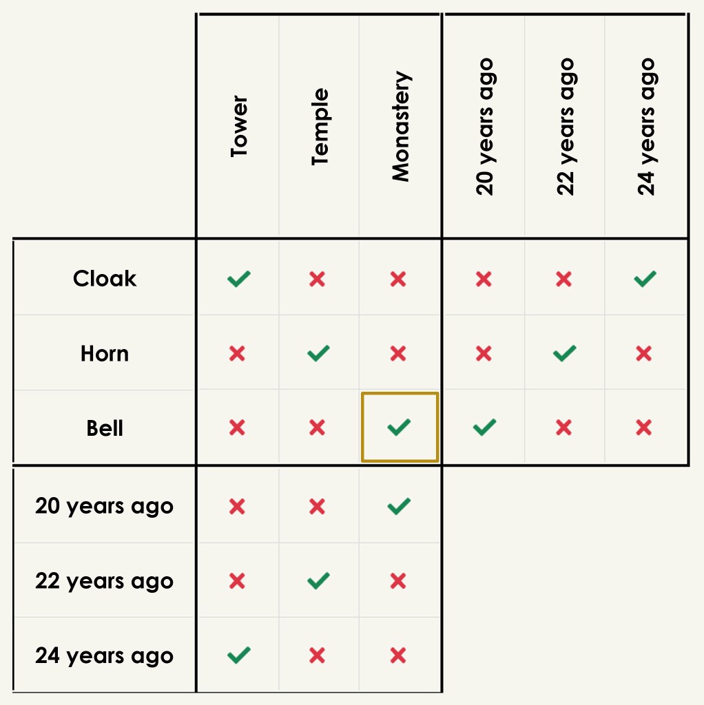 The heart of logic puzzles is a process of elimination: which thing is matched to which other thing and which is excluded from that thing? You can just make a very basic logic puzzle out of this. One clue rules out suspect A; another clue rules out suspect B; therefore, the perpetrator must be suspect C.