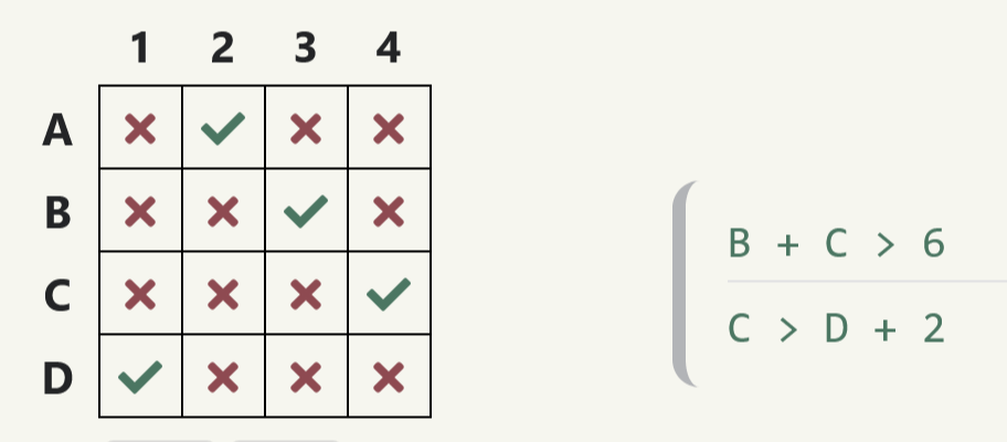 In this example from Aha! Puzzles again, we see the solution. We start by seeing that B+C must be greater than 6. The only way that can be is if one is 3 and the other 4. Then we see that C must be greater than D+2. If D is even just 1, then D+2 is 3, so C can only be 4 to be greater than that. Now we know that C is 4, D is 1, so B (which we established can only be 3 or 4) must be 3, and–by process of elimination, A must be 2.