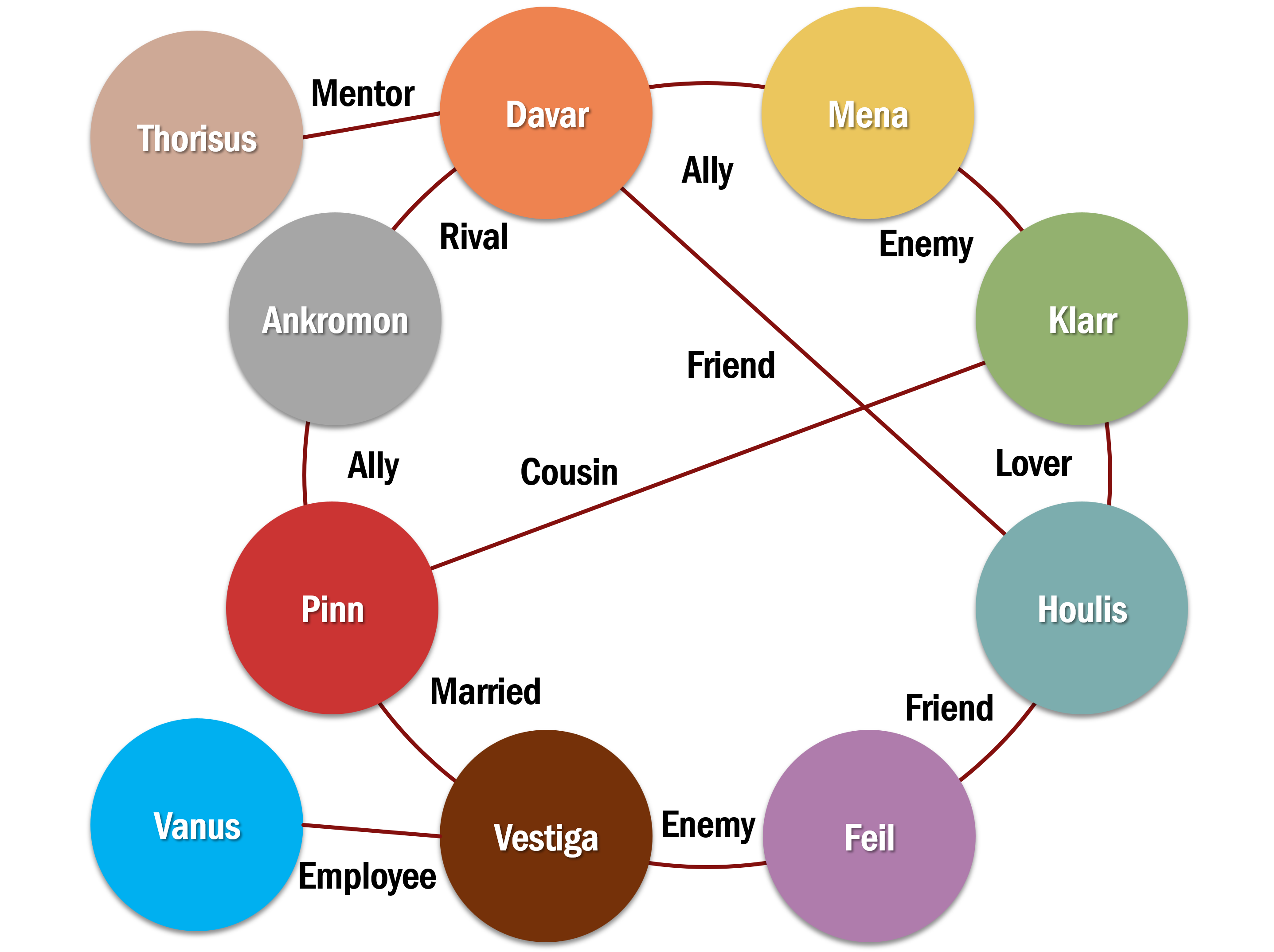 For relationships that aren’t reciprocal–like mentor, parent, and employee–you’ll need to decide which is which. Relationships tend to carry over, so Vestiga, who is married to Pinn, is probably quite friendly with Pinn’s ally Ankromon. Likewise, Pinn is probably quite frosty to his wife’s enemy, Feil.