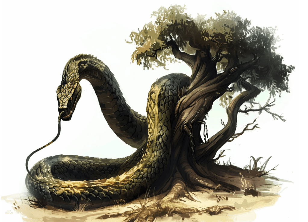 - Curled around a large tree, watching, waiting.