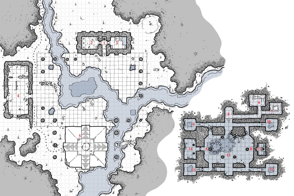 The map below shows a largely dry compound because is not meant to go with the Sunken Temple art. But for this adventure, all of this is under water. Instead of the staircase in 3 leading down into the dungeon at 6, it is accessed thru a staircase behind a concealed door in the worshiping chamber.