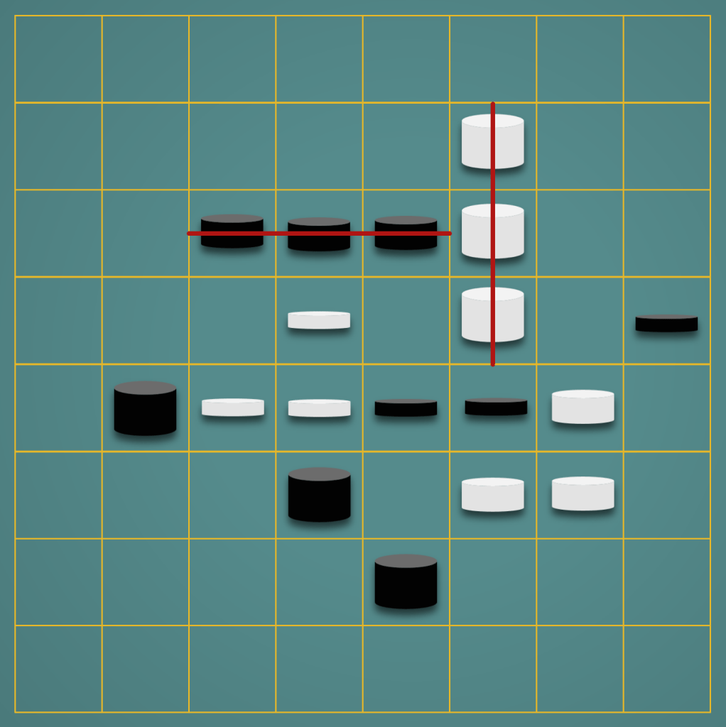 Play repeats in this A, B, C cycle until one player has made five 3s-in-a-row orthogonally (as a rook moves) or diagonally (as a bishop moves). These only count if they are the same type and color: AAA, BBB, or CCC.