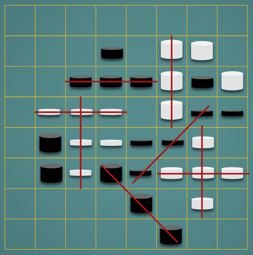 This is a board game played on an 8×8 grid, such as a checkerboard. Players alternate placing pieces in an attempt to make 3s-in-a-row.