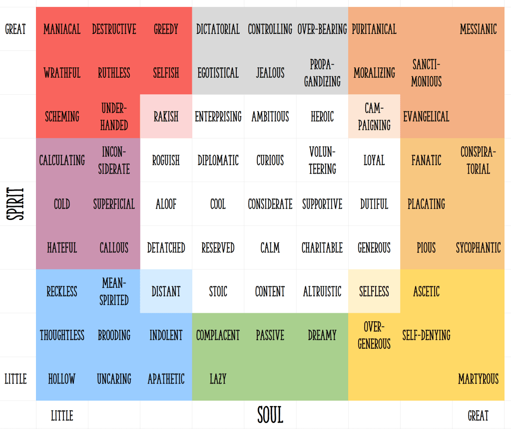 In the table below, you can think of the central area as “normal” and the colored areas as increasingly extreme. There’s no need to try to quantify these (spirit of 4 and soul of 6 or whatever). Just play around with the words themselves as ways to understand what a character or creature wants and how it would behave.