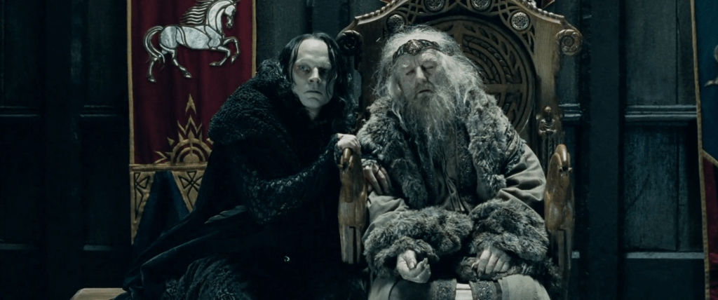 Theoden, King of Rohan, is old and decrepit, kept alive seemingly only by the ministrations of his advisor, Grima Wormtongue. Once a mighty horseman, he now can barely speak; his will is weak and fearful. As a result, the land of Rohan is troubled by orcs and wild men of Dunland.
