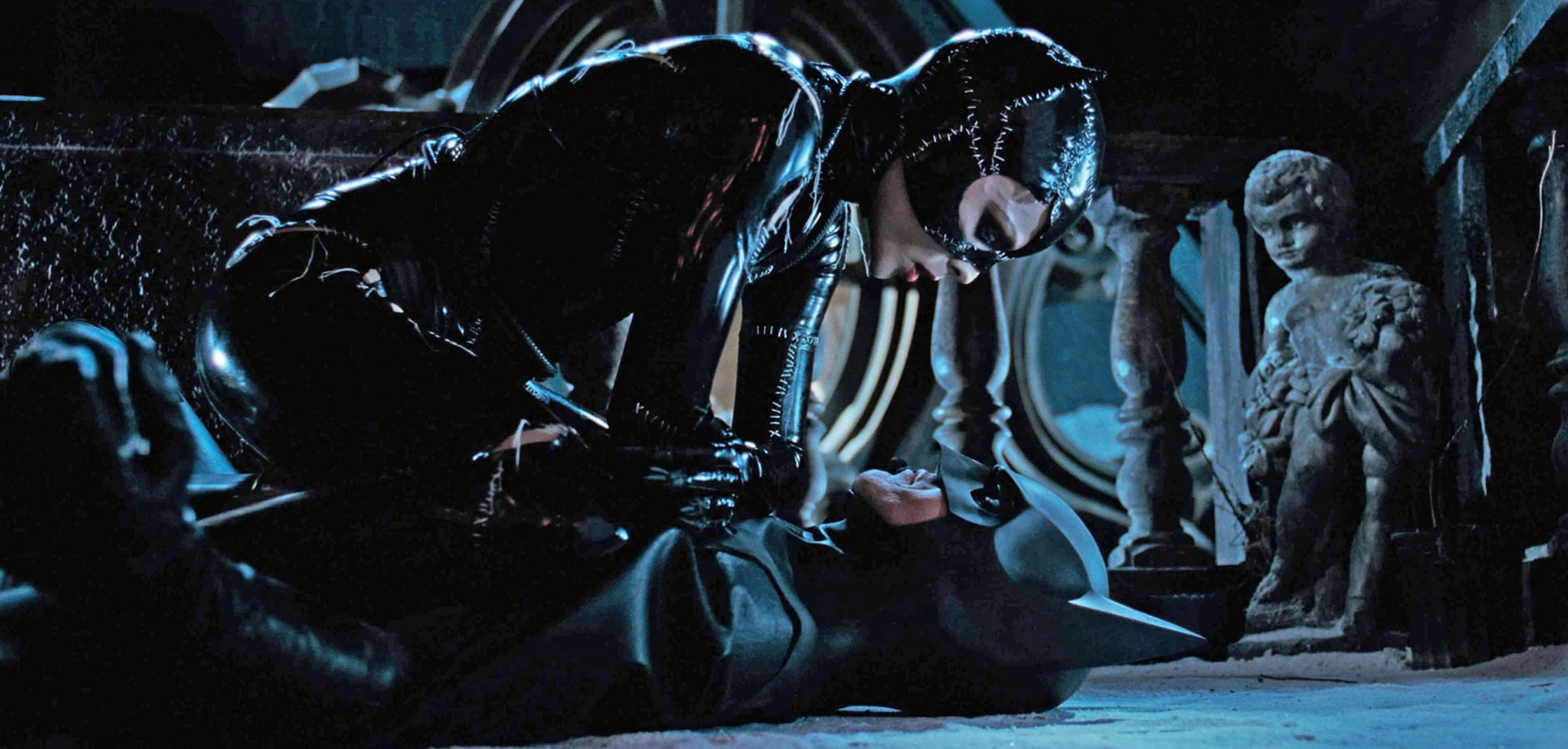 Selina Kyle is the assistant of industrialist Max Shreck, who tries to kill her when she uncovers his evil plot to steal electricity from Gotham City. A brain injury makes her into a confident and ruthless personality: Catwoman. In this guise, she allies with the villainous Penguin–whom Shrek is helping to run for mayor–against the hero Batman–even while her alter ego is becoming romantic with Batman’s alter ego, Bruce Wayne.
