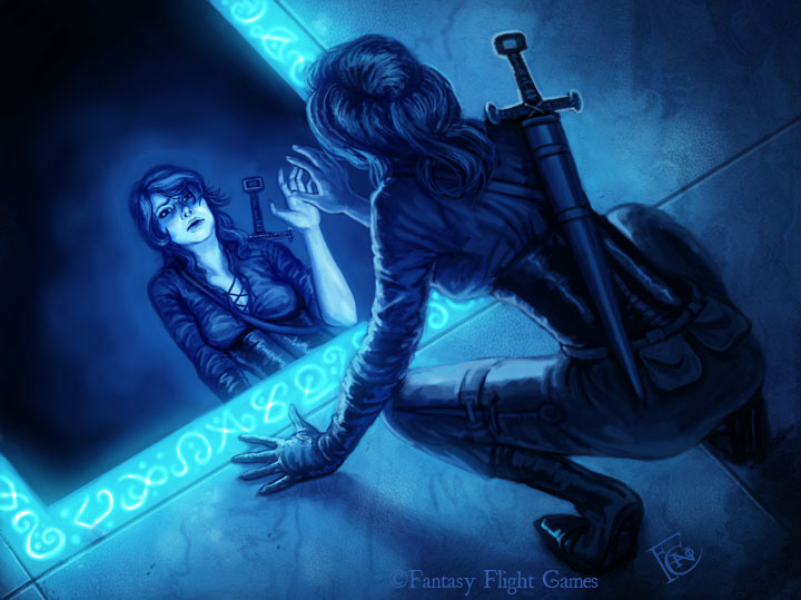 You can have a player act this out with a real mirror and stand-in object. For an extra challenge, the mirror may also show the object surrounded by thorny vines (or poison ivy) that are not there in real life but which will harm the character if he or she is looking in the mirror while trying to grasp the treasure. You might simulate this with plastic cups surrounding the item that, if touched by the player, cause the character damage.