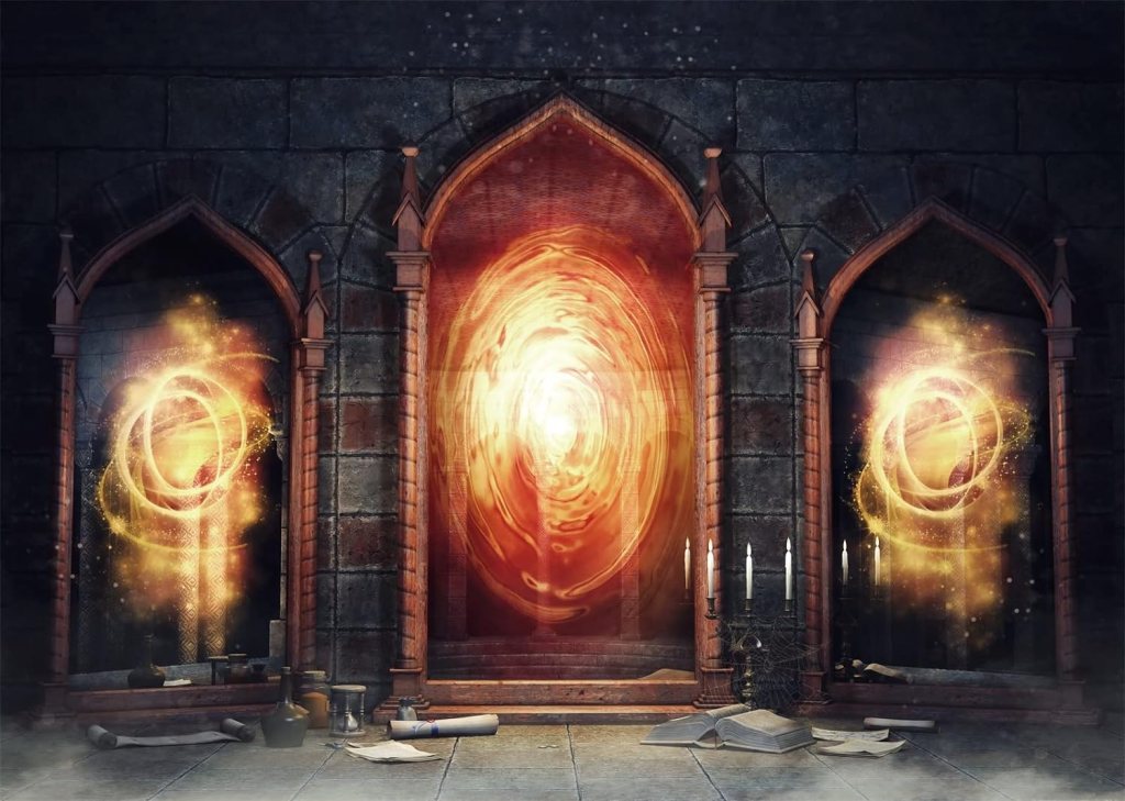 In one chamber, you find a large mirror. In another, you find a reflecting pool that, when examined while it is still, seems to reflect an image of another chamber (the one where the mirror is). An object poked into the pool will smoothly pass further than the pool is deep. If you enter the pool, you pass thru a portal and come out thru the mirror.