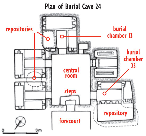 - Burial chamber(s) with shelves, benches, or sarcophaguses to hold bodies