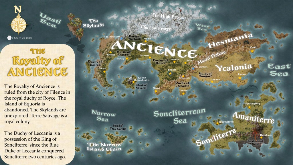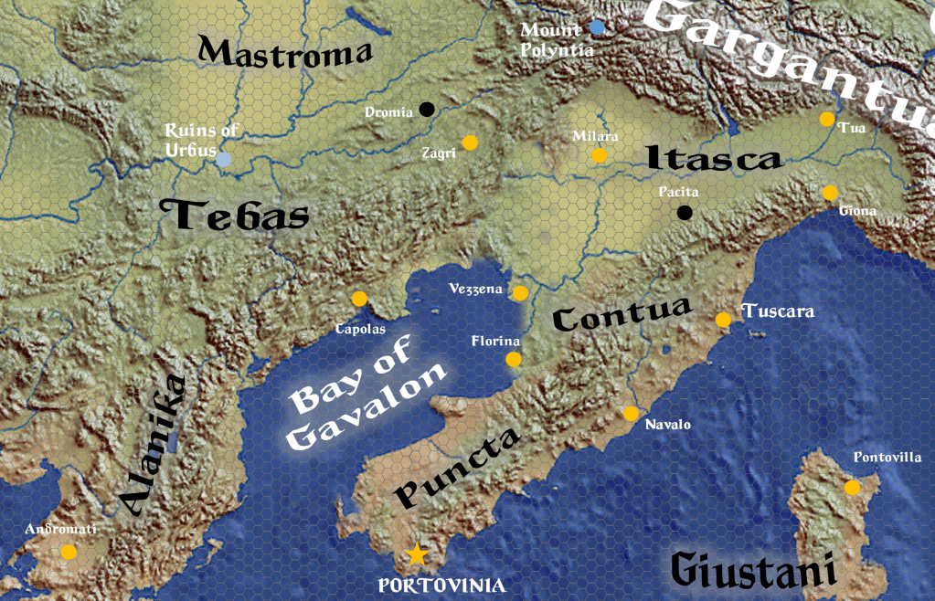 My preferred technique is to create a large-scale map of your realm with 18- or 36-mile hexes. Add geographical labels as before and major points of interest–but just the biggest cities and best-known perils. (Everyone knows where the earthquake-ruined city of Voril lies and that Smoke Top is home to Marbralga the crested dragon.)