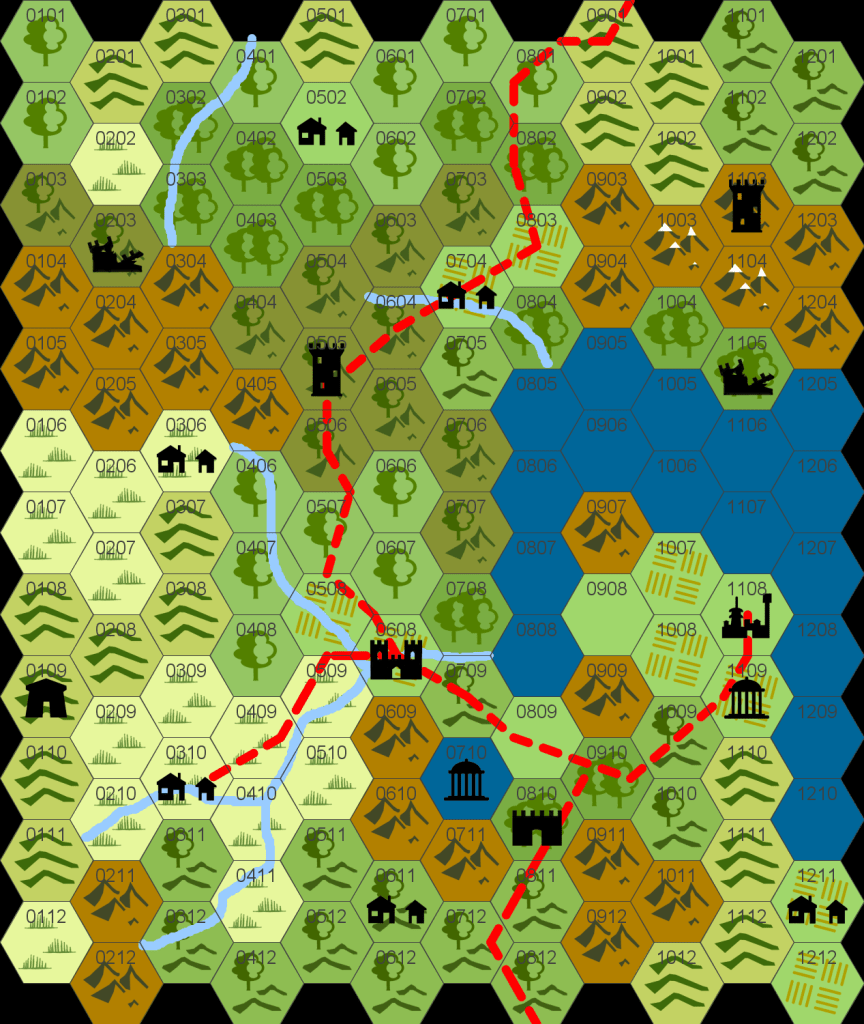 This is basically your list of ideas for adventures. You’ll add them to the map as your adventures progress. If you want the heroes to do a bit of traveling, give them a reason to go to the Hall of Dark Dwarves and place it three or four hexes away from their current location. Note that inhabited cities and castles and some well-known ruins and perils are labeled directly on the map. Any inhabited 6-mile hex without a city or castle is assumed to have 1d6+10 manors and one town (1-4) or coaching inn (5-6). Every inhabited 36-mile hex should have a city surrounded by 1d6 towns with numerous manors in between.