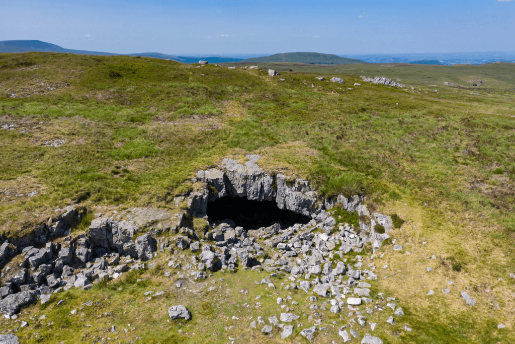- A sinkhole leads down into the depths to a natural cavern complex with some side passages part-way down.