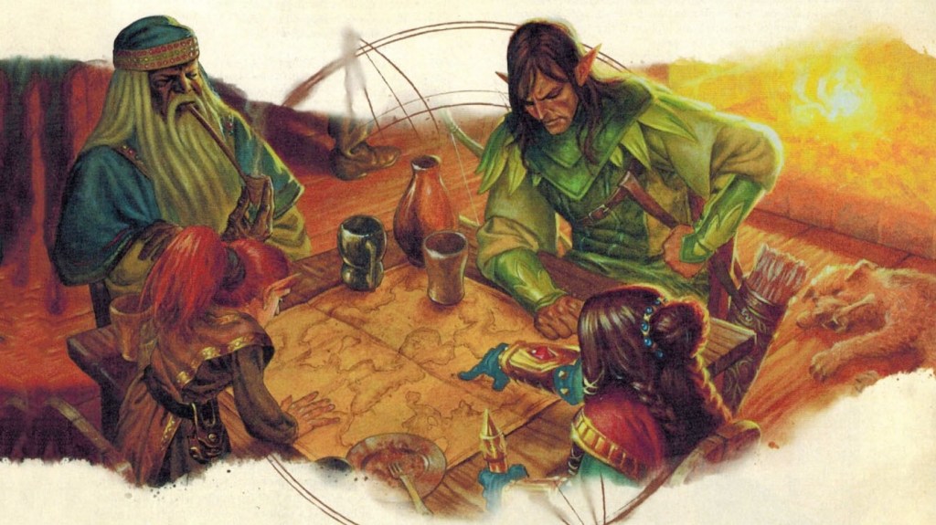 For example, one innkeeper knows the girdle of giant strength worn by Dame Peppis was lost was she fell in a running battle with ogres, but the location of that battle is unknown. Elsewhere, an old storyteller at a tavern tells all about the fall of Dame Peppis in a battle with several ogres not far away, in the hills of Boroll–but his story doesn’t mention any magic belt. Now the heroes have enough information to seek out the remains of Dame Peppis in the hills of Boroll and recover the belt–and they’ve earned it by gathering information.