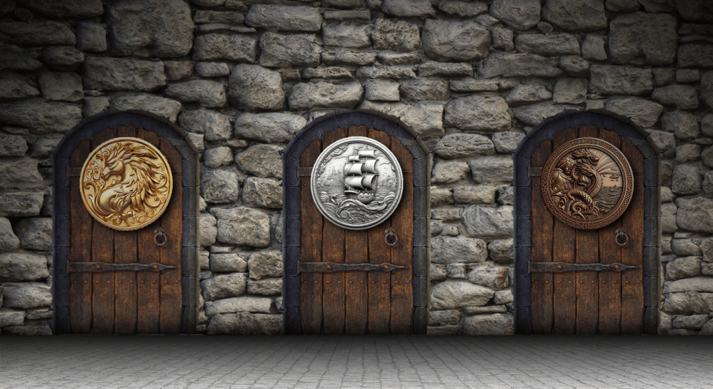 While dungeon delving, the heroes come upon a trio of doors and are offered a choice by an illusion or spirit of the dungeon’s creator. If they select incorrectly, the treasure will disappear. They select a door, and one of the other doors that is empty is opened for them. And now they are offered the chance to choose again. Make it clear that the choice is real and fair by, for example, printing the above image and hiding a token under one of the doors. (Cut the doors so they swing open, but leave a little tab by the locks, so they stay closed until it’s time.)