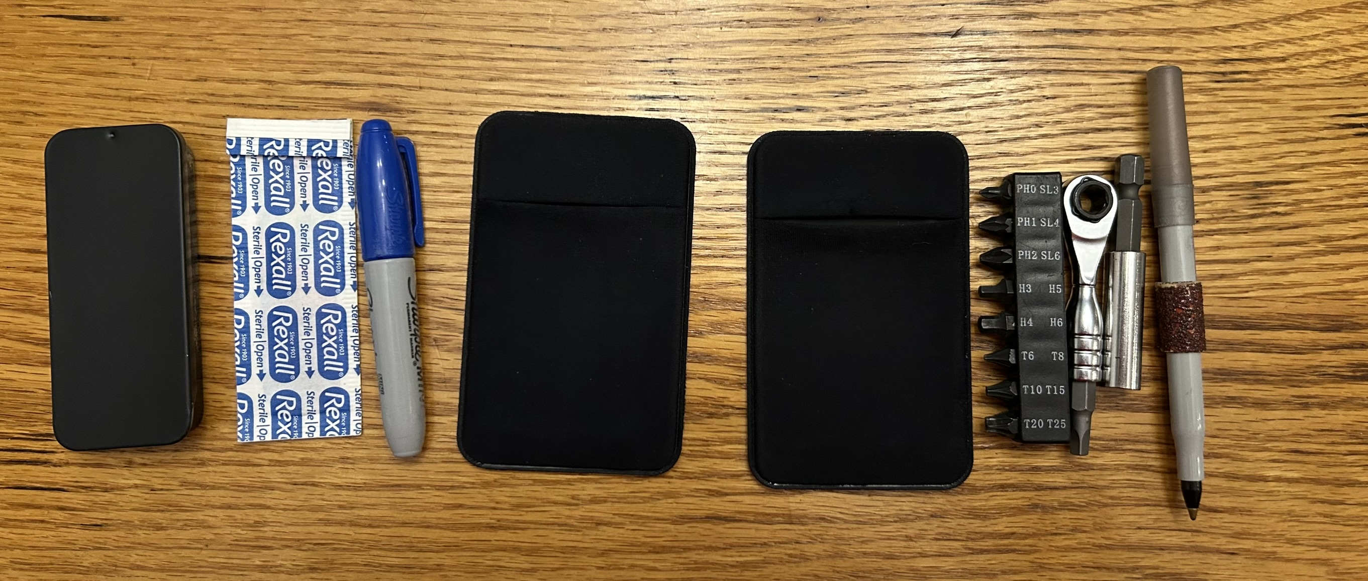 As pictured, I’ve got a band-aid, mini-Sharpie, and small organizer tin in one and a 711L ratchet driver and Steinwhale stubby bits and extension, and cut-down ballpoint pen in the other. Since they have adhesive backs, you might print off an emergency info card, laminate it, and stick one on the back of one or both pockets.