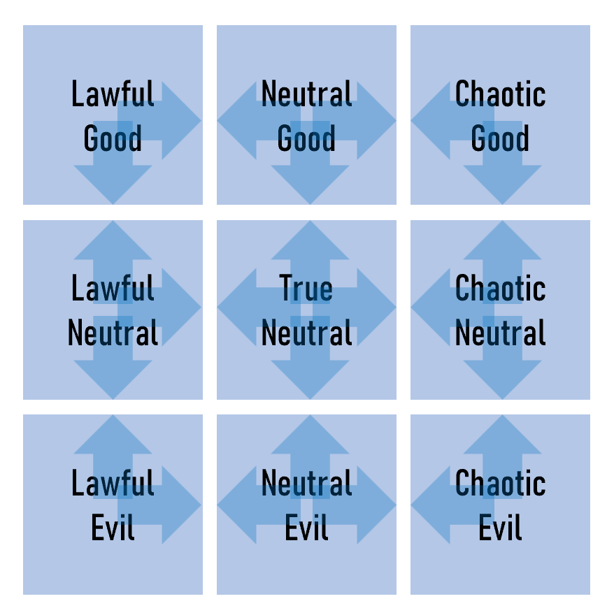 I like alignment. I think it’s a useful shorthand for how various creatures behave. I like my monsters monstrous, so I can’t stand the idea of an orc paladin.✽ I wrote previously about changing from the traditional D&D nine alignments to just four alignments. But now I think a more useful way to think about alignment is by assigning them less restrictively.