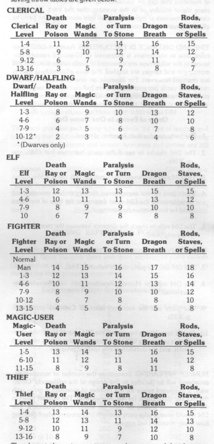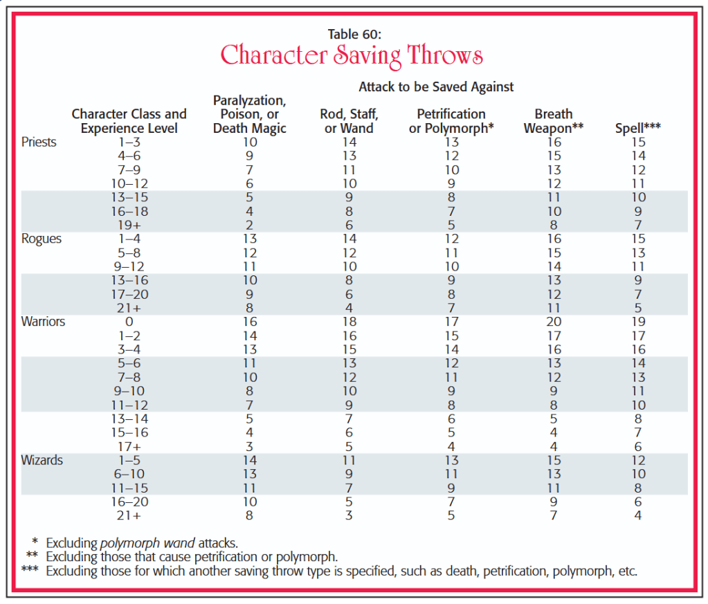 Comparing the old table with the revised 2e table, we can see that both the numbers and categories are pretty arbitrary. Are rods and staves more like wands or more like spells? But they start around 14 or 16 for most things for most classes and end up around 5 or 6 by high level, except for death ray and poison, which is more generous.